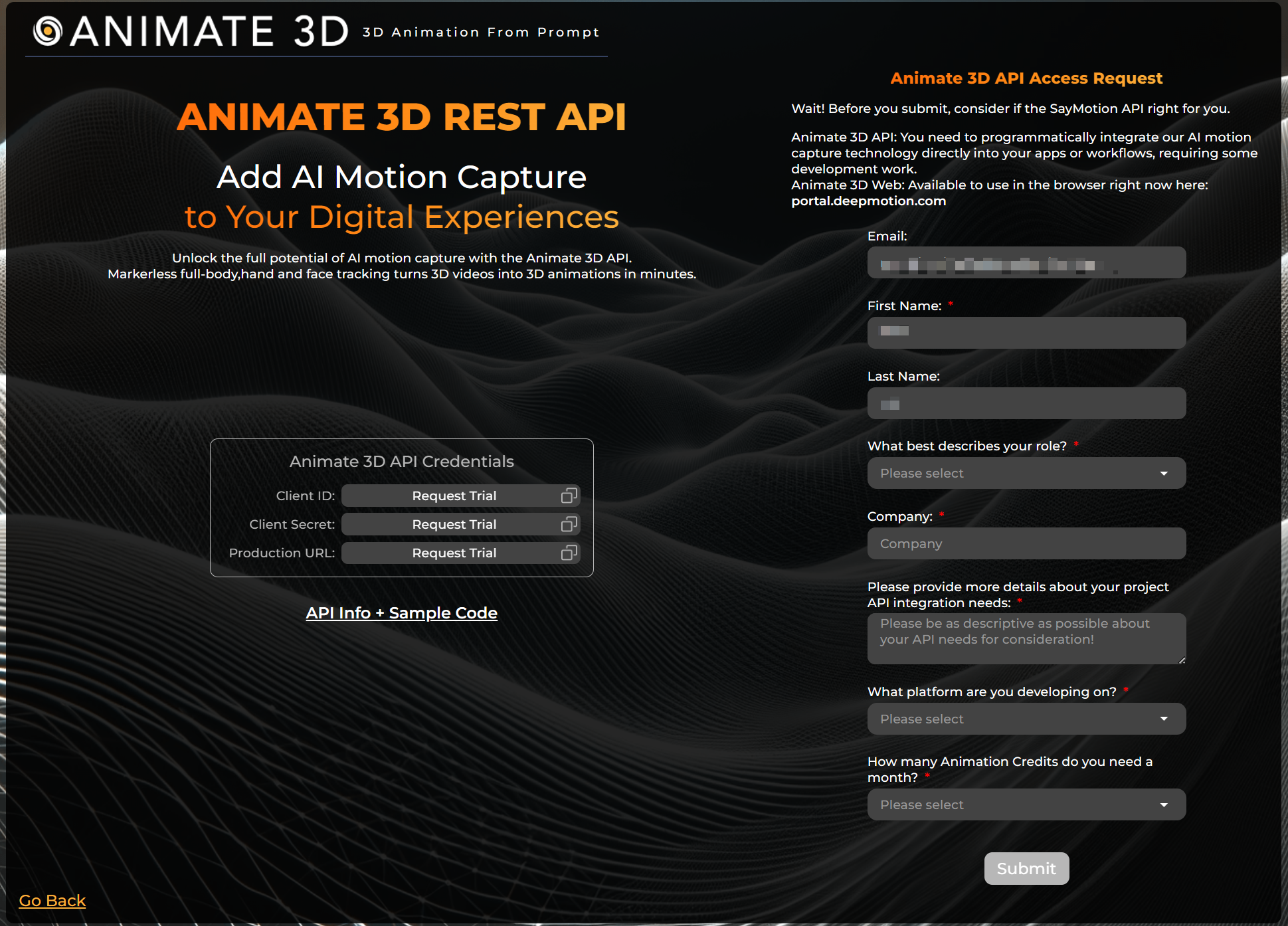 Use the Animate 3D REST API to create 3D animations and download in FBX, BVH, and more. Access motion capture from any video on any device without suits or hardware.